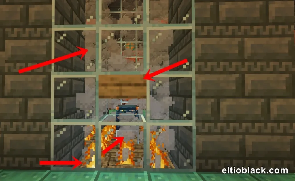 Paso 2: ahora coloca «hogueras» o también llamado fogatas, una losa para que los mobs puedan verte y así de simple en tu siguiente misión cada 30 minutos podrás farmear llaves y cosas, añade dos puertas vaya para que puedas entrar y salir